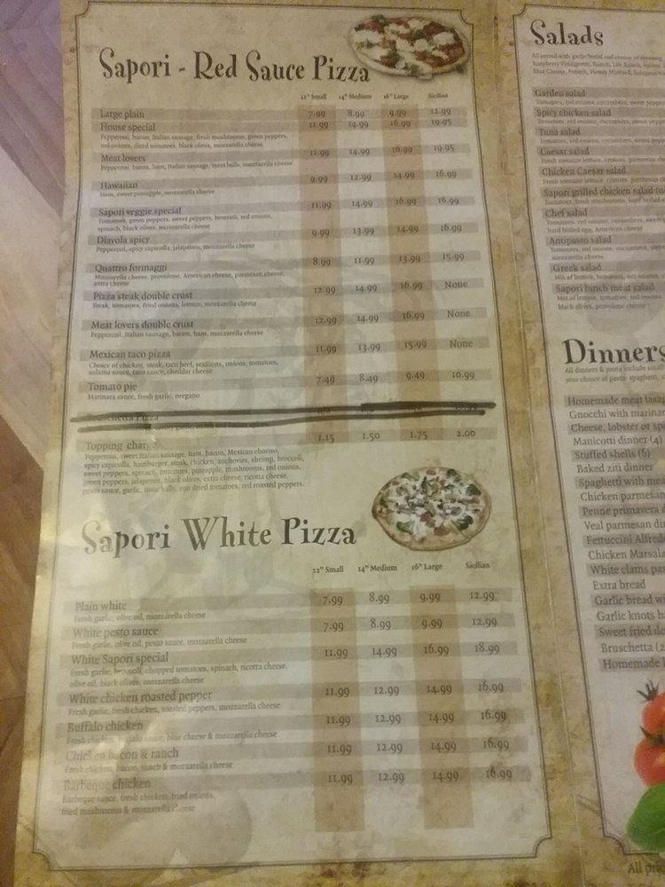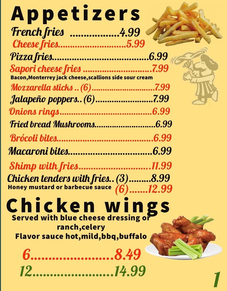 Pizzeria Dei Sapori in West Grove, PA offers a diverse menu that includes delicious starters like chicken tenders, jalapeno poppers, and mozzarella sticks. Their salads, including the Antipasto Salad and Caesar Salad, are made with fresh ingredients and bursting with flavor. A standout dish is the Sapori Style Chicken Wings, available in various flavors and served with blue cheese or ranch dressing. The restaurant also caters to vegetarian options and is perfect for families with kids, groups, or those looking for outdoor seating. The alcohol selection and bike parking further enhance the dining experience at this establishment. Overall, Pizzeria Dei Sapori promises a mix of quality food, convenient services, and a welcoming atmosphere for all guests.